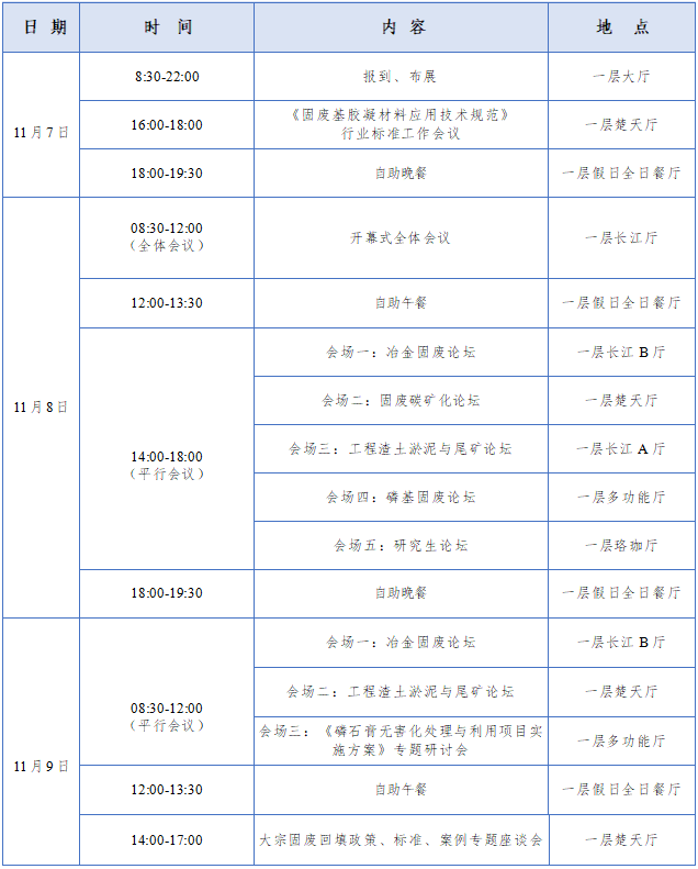 大会以全体会议+分论坛的形式,拟设置六大分论坛,其中包括:冶金固废论坛、尾矿论坛、固废碳矿化论坛、工程渣土淤泥论坛、磷基固废论坛、研究生论坛。