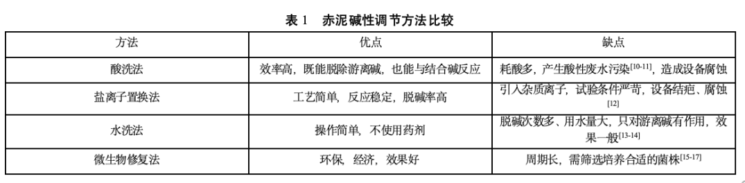 水洗法是最简单最经济的赤泥脱碱方法。赤泥中的碱分为结合碱和可溶性碱,可溶性碱占比约20%~25%,其余都是结合碱[19]。KINNARINEN等[20]发现钠离子的回收率随洗涤比的增加而增加,并提出使用压滤机对赤泥进行脱水和洗涤,可以提高钠的回收率。朱晓波等[21]曾对赤泥水洗脱碱的影响因素和动力学进行了研究分析,发现水浸4次、液固质量比为9mL/g时,在90℃、反应60min的脱碱率最好,高达71%;同时,未反应收缩模型数据模拟表明赤泥水浸脱碱过程受到内扩散过程的控制,这为后期控制温度提高脱碱率提供了思路方向。微生物修复法是利用微生物代谢产生的有机酸中和赤泥中的碱。窦志文[22]发现微生物群落的生命活动对赤泥碱性调节具有重要作用。张立平[23]向赤泥中添加土壤微生物和有机质,研究发现添加有机质可以促进微生物产生有机酸,达到降低pH的作用。